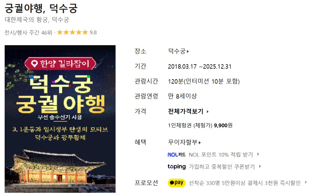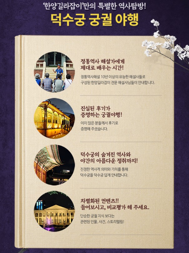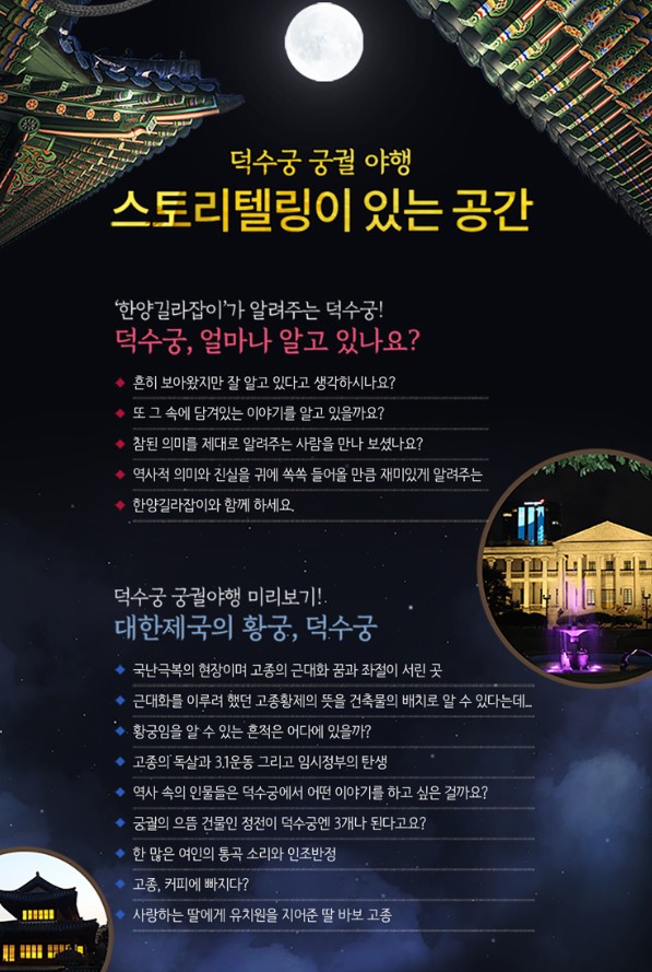 덕수궁 궁궐야행은 서울 도심 속에서 조선시대의 역사와 문화를 체험할 수 있는 야간 프로그램입니다.