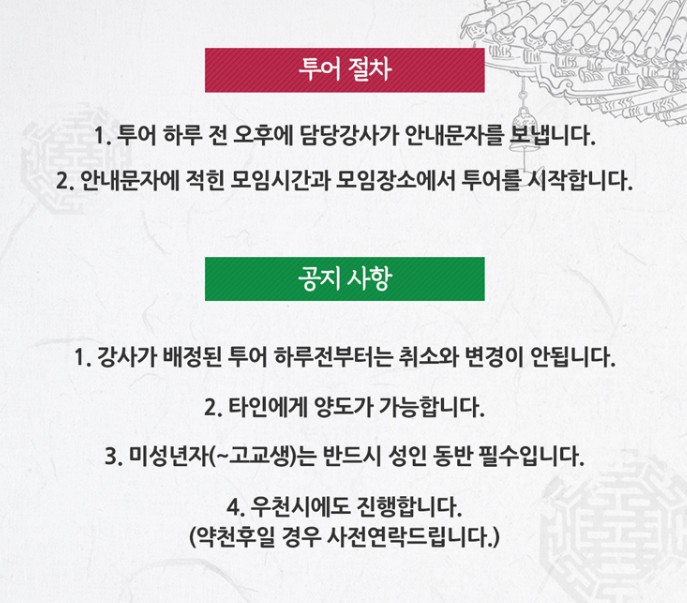 - 시간 엄수: 출발 시간 이후에는 합류가 불가하므로 최소 10분 전 도착을 권장합니다.