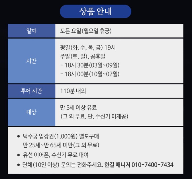 각 구간마다 전문 해설사가 배치되어 덕수궁에 담긴 고종 황제의 이야기, 대한제국의 역사, 그리고 각 전각의 의미에 대해 상세히 설명해줍니다. 지루하지 않고 쉽게 설명해주어 남녀노소 모두 이해할 수 있습니다.