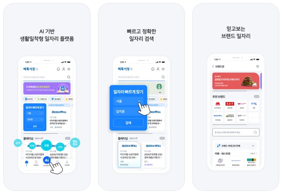 신문광고처럼 다양한 일자리를 빠르게 확인할 수 있고, 지역별로 나뉘어 있어 집 근처 일자리를 찾기에도 딱 좋습니다.