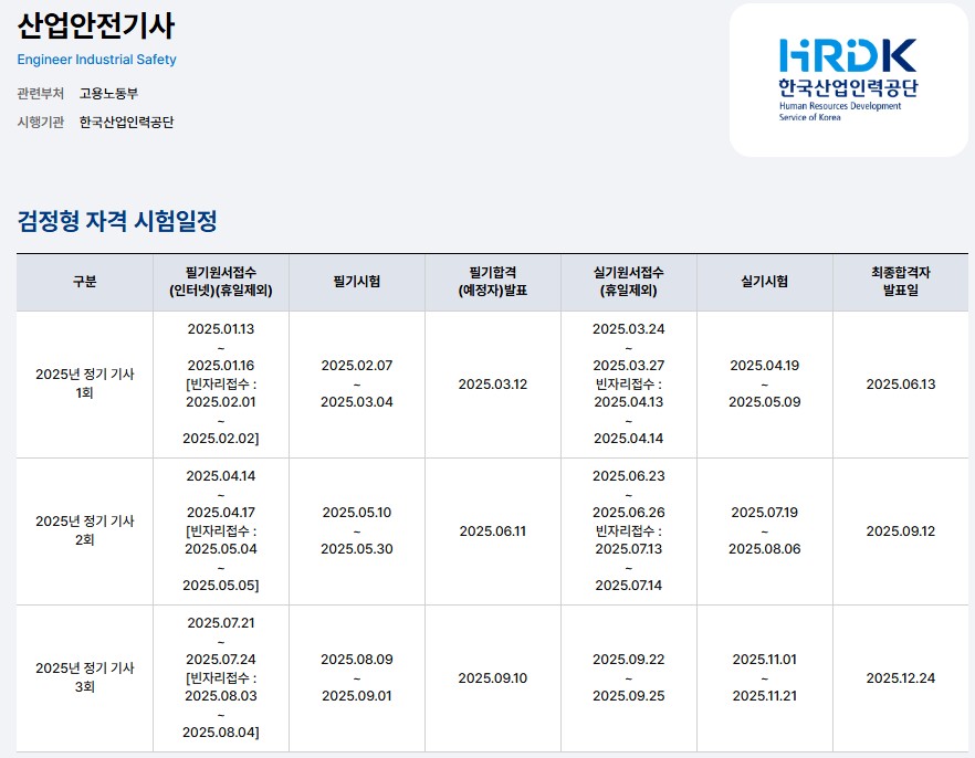 아래는 한국산업인력공단 큐넷을 기준으로 정리한 2025년 산업안전기사 필기 및 실기 시험 일정입니다.